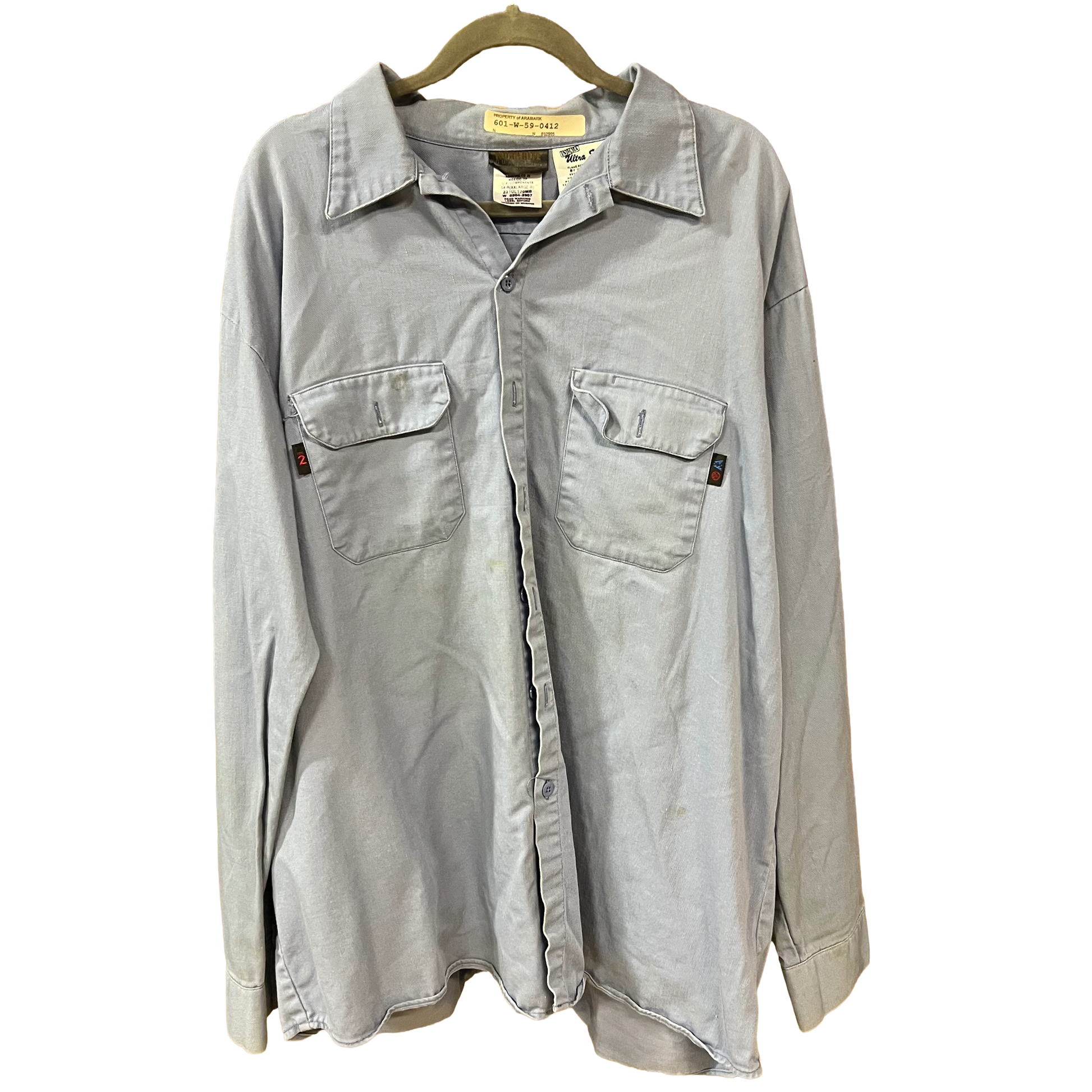 Workrite used and with some staining. No company embroidery on shirt.